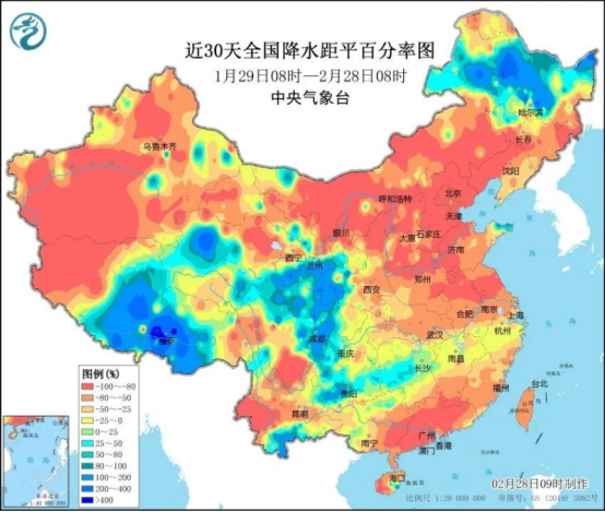 2月(截至2月26日),全国总体气温偏低,降水偏少,有3次冷空气过程,气温波动起伏明显,华南中东部及云南南部气象干旱持续。主要特点如下: