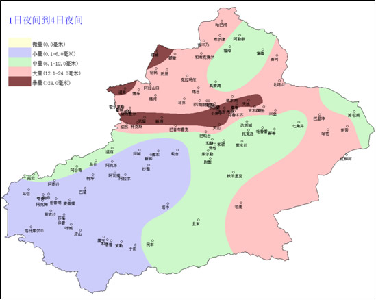 预计8月1日夜间到4日夜间,我区将有一次大范围明显降水天气,其中伊犁河谷、天山山区及其两侧和南疆西部、巴州、哈密等地的部分地区有大到暴雨(12~50毫米),暴雨极易引发洪水、泥石流及山体滑坡等灾害,对交通运输、旅游影响较大,各地尤其是地震灾区要做好防范工作。