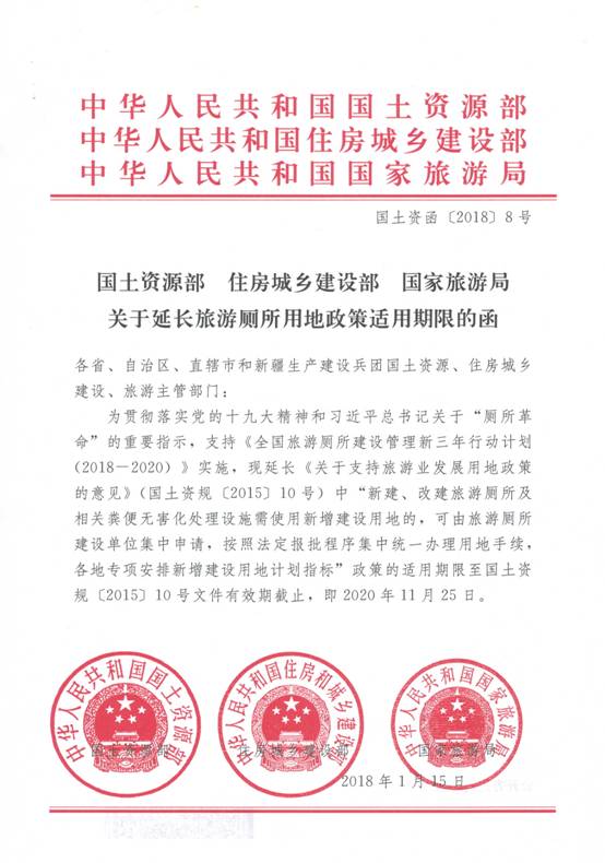 近日,国土资源部住房城乡建设部国家旅游局联合印发了《国土资源部住房城乡建设部国家旅游局关于延长旅游厕所用地政策适用期限的函》(国土资函〔2018〕8号),现转发你们,请遵照执行。