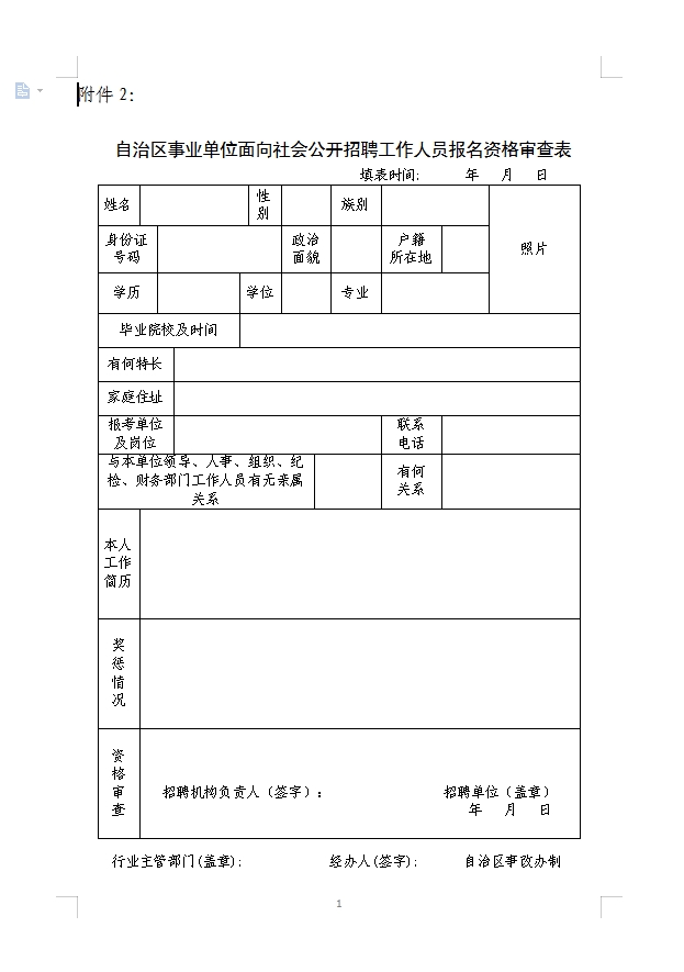 (一)参加资格审查人员须携带《自治区事业单位面向社会公开招聘工作人员报名资格审查表》(一式2份,详见附件2);本人有效期内的身份证、毕业证、学位证、报名表、准考证及招考职位需要的其他证件的原件及复印件;海外留学归国人员还须提供教育部留学认证证书的原件及复印件。
