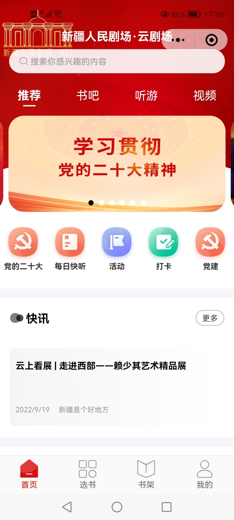 新疆艺术剧院人民剧场党支部书记、主任田康介绍,“云剧场”中还专门设置了“学习贯彻党的二十大精神”专区,包括学报告、学党章、学决议、代表风采、视听空间等子栏目,为广大党员干部群众学习党的二十大精神提供准确详尽的学习资料。