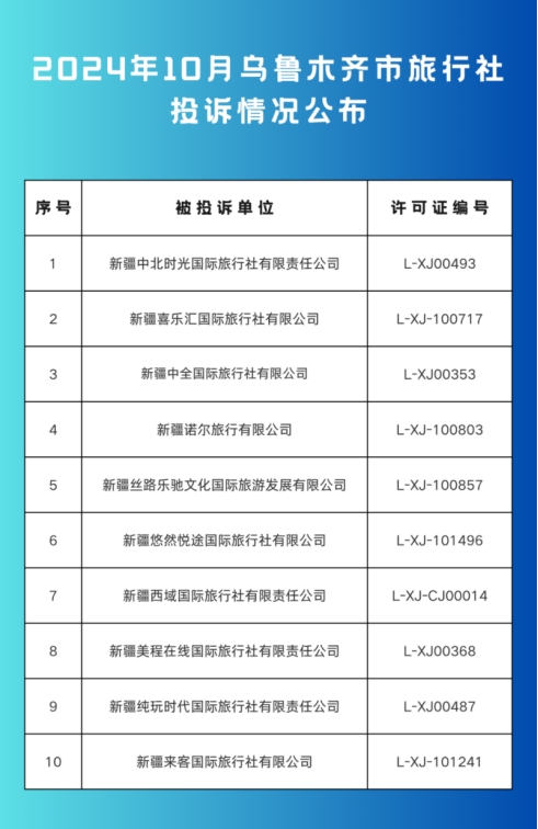 根据乌鲁木齐市旅行社涉诉情况统计,现公布2024年10月1日至31日乌鲁木齐市投诉量排名前十家旅行社名单(含投诉量相同旅行社):